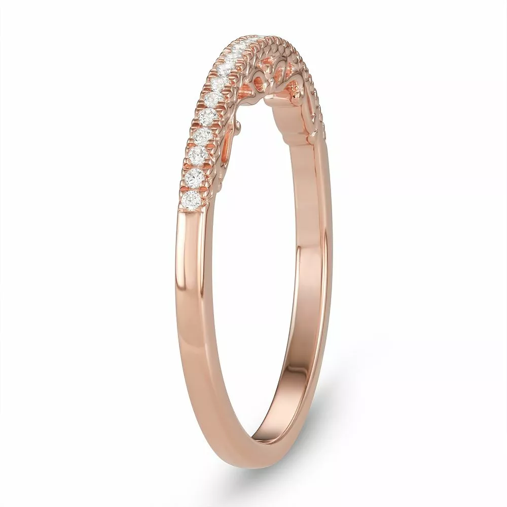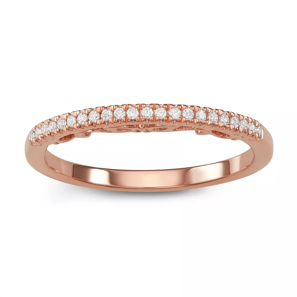 Scintillating round-cut diamonds line the front of the band, making this 14k gold ring one she’s sure to treasure.