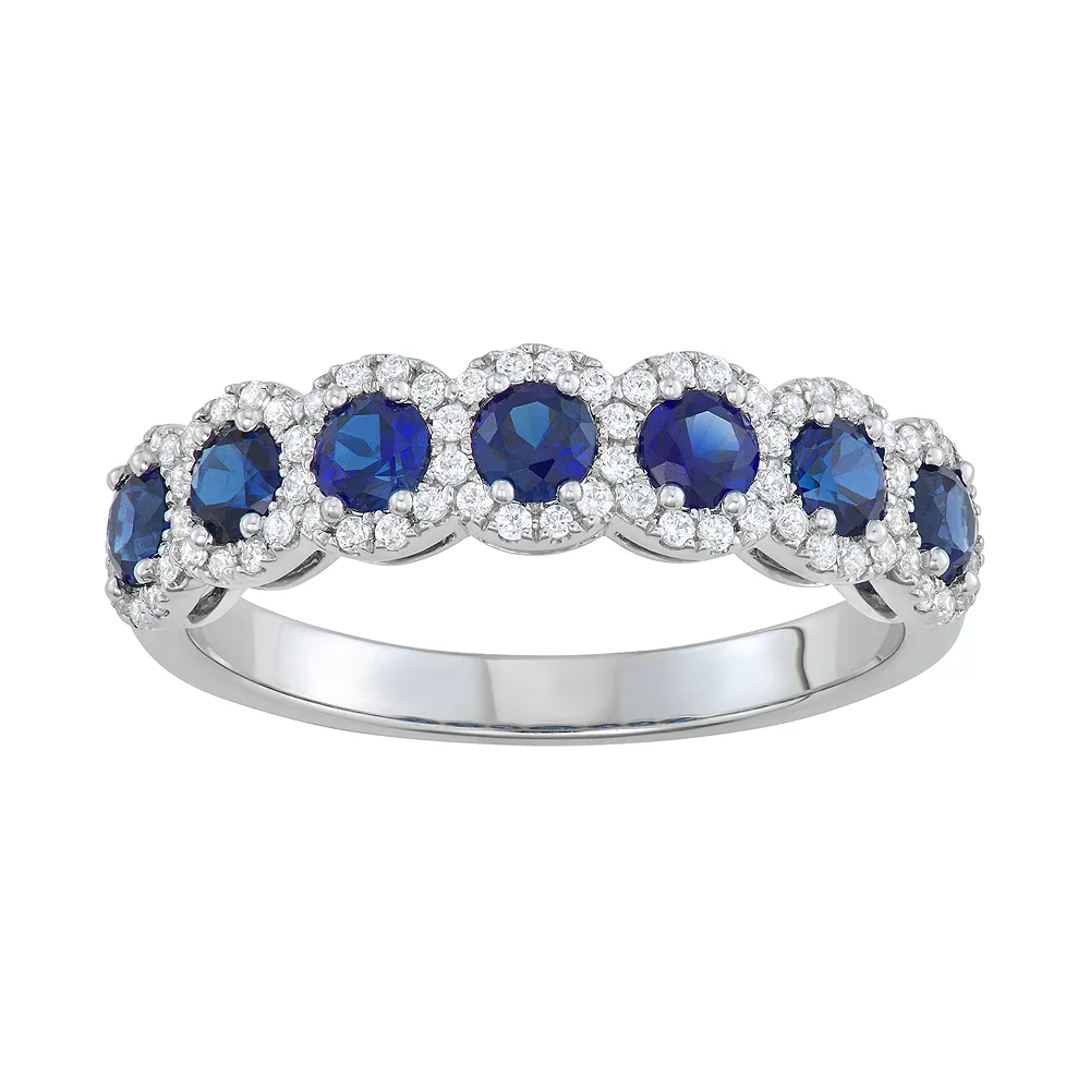 Designed with eye-catching sapphires surrounded by halos of diamonds, this 14k white gold ring is a captivating accessory.