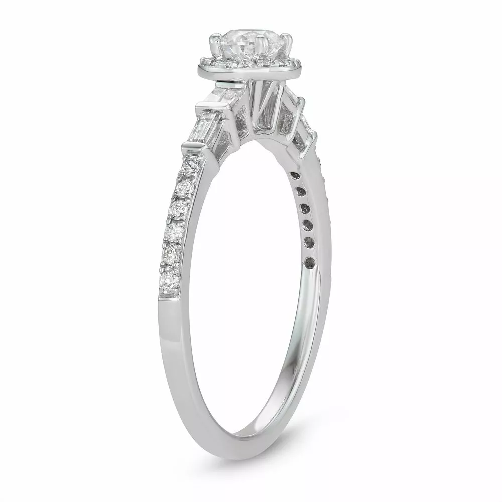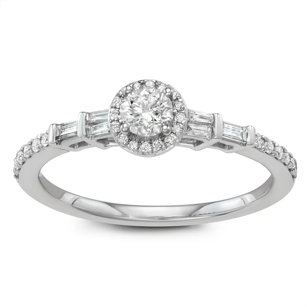 Designed with a halo motif decorated with round-cut diamonds, this 14k white gold engagement ring signifies your devotion in a wondrous way. Further detailed with round- and baguette-cut diamonds on the band, this Simply Vera Vera Wang engagement ring is sure to draw attention.