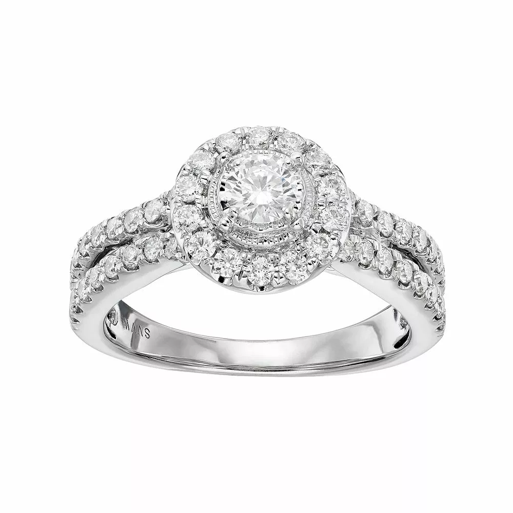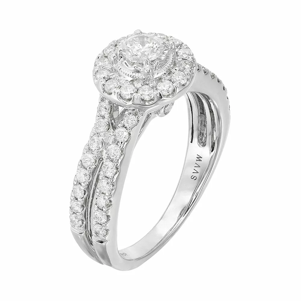 Make memories for a lifetime when you propose with this captivating Simply Vera Vera Wang engagement ring. Accentuated with round-cut diamonds situated in a halo motif and along the split-shank band, this 14k white gold engagement ring is impressive.