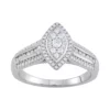 Tiers of round-cut diamonds serve as the dazzling focal point for this 14k white gold halo engagement ring set. A matching wedding band completes this beautiful pair.