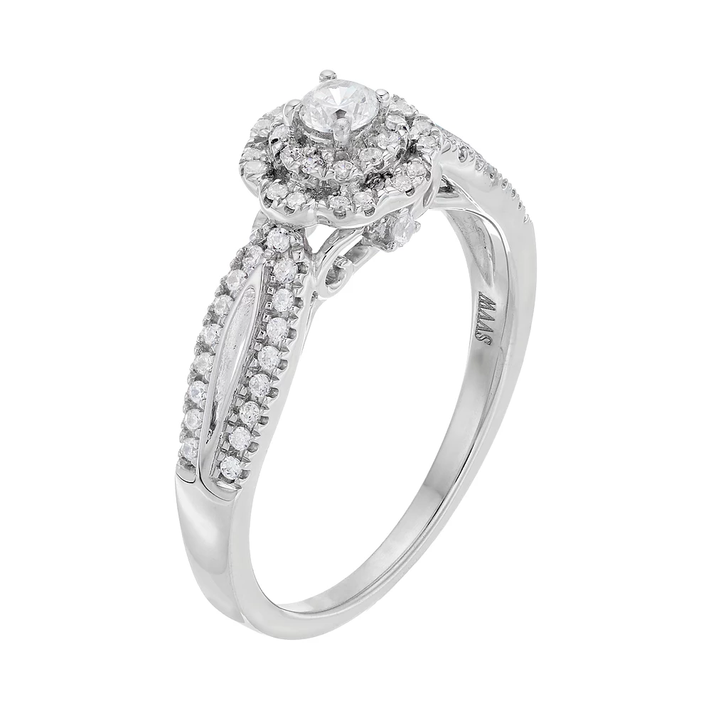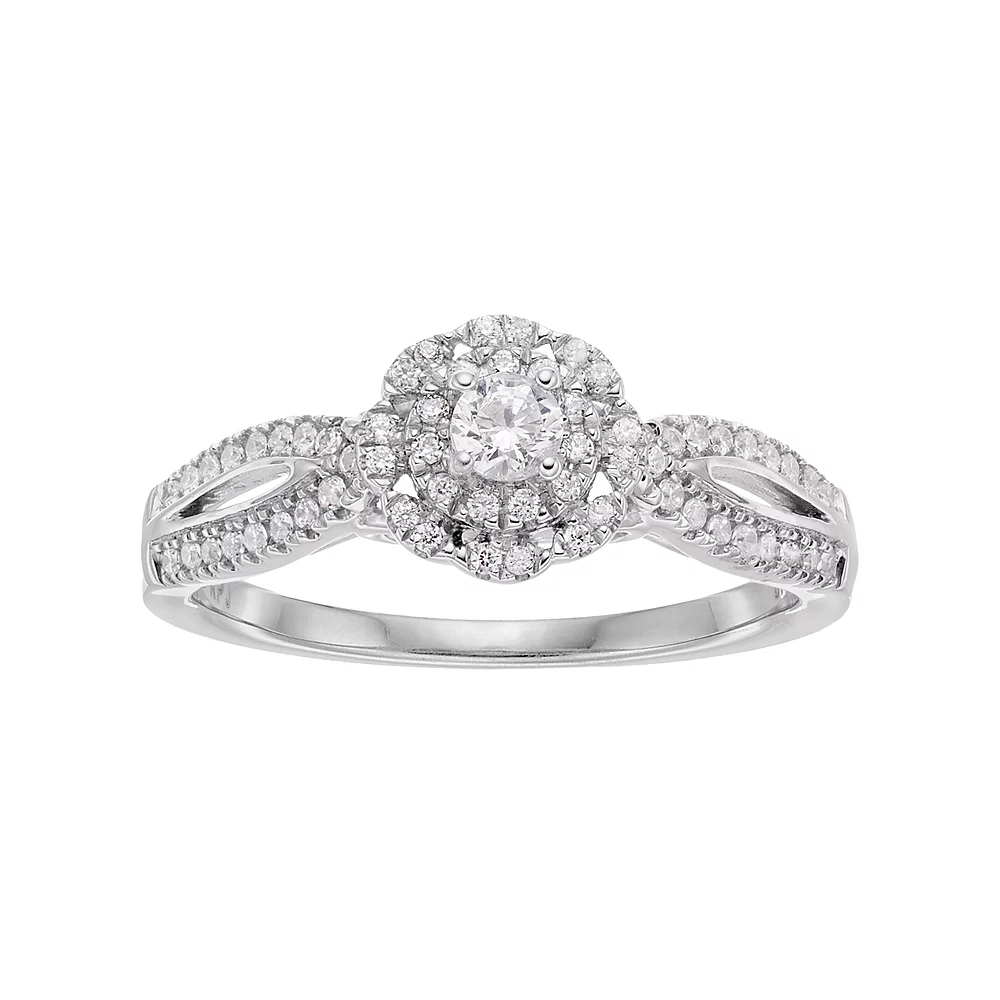 Accentuated with sparkling round-cut diamonds, this 14k white gold halo engagement ring sparkles from every angle. Symbolize your love in an awe-inspiring way when you present her with this Simply Vera Vera Wang engagement ring.